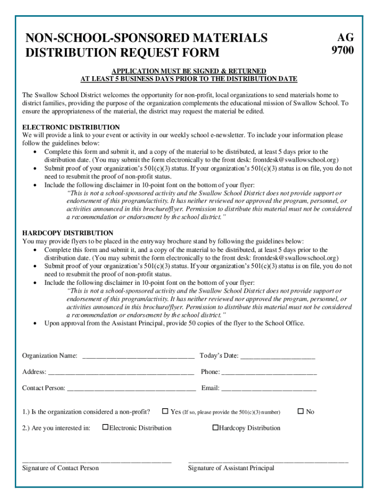 AG 9700NONSCHOOLSPONSORED MATERIALS DISTRIBUTION REQUEST FORM APPLICATION MUST BE SIGNED & RETURNED AT LEAST 5 BUSINESS DAYS PRIOR TO THE DISTRIBUTION Battle Swallow School District welcomes the opportunity