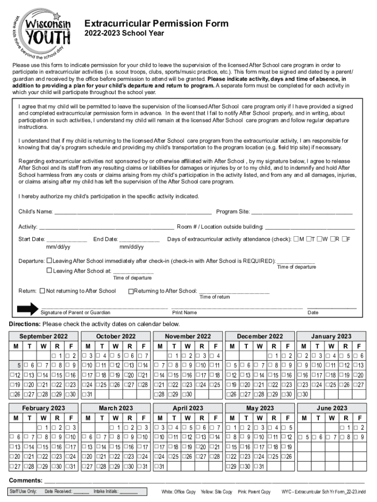 Extracurricular Permission Form20222023 School Release use this form to indicate permission for your child to leave the supervision of the licensed After School care program in order to