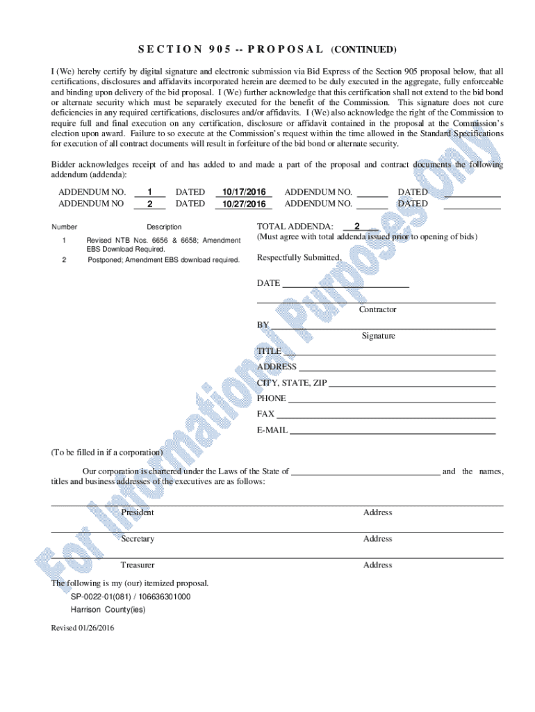 S E C T I O N 9 0 5 P R O P O S A L (CONTINUED) I (We) hereby certify by digital signature and electronic submission via Bid Express of the Section 905 proposal below, that all certifications, disclosures