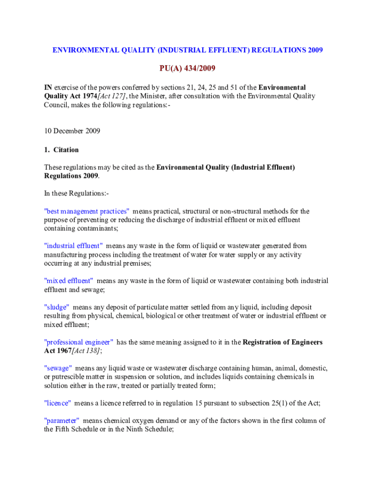 ENVIRONMENTAL QUALITY (INDUSTRIAL EFFLUENT) REGULATIONS 2009PU(A) 434/2009 IN exercise of the powers conferred by sections 21, 24, 25 and 51 of the Environmental Quality Act 1974[Act 127], the Minister,