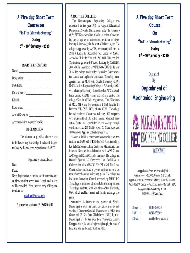 A Five-day Short Term Course on IoT in Manufacturing During TH 6 10 January 2020REGISTRATION FORM Name: ___ Designation: _ ___ Mobile No.:___ College Name: ___ Email: ___ Experience: ___ Area of Research: