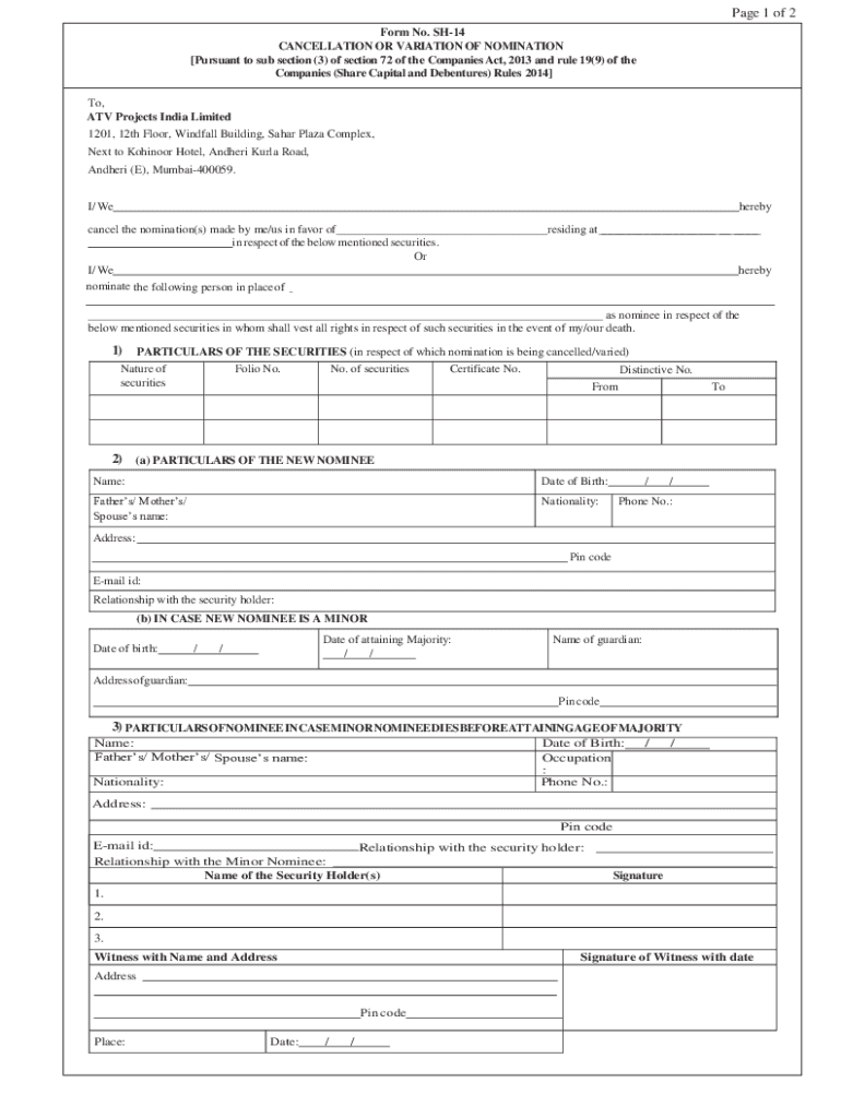 Page 1 of 2 Form No. SH14 CANCELLATION OR VARIATION OF NOMINATION [Pursuant to subsection (3) of section 72 of the Companies Act, 2013 and rule 19(9) of the Companies (Share Capital and Debentures)