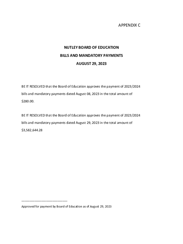 APPENDIX CUTLERY BOARD OF EDUCATION BILLS AND MANDATORY PAYMENTS AUGUST 29, 2023BE IT RESOLVED that the Board of Education approves the payment of 2023/2024 bills and mandatory payments dated August