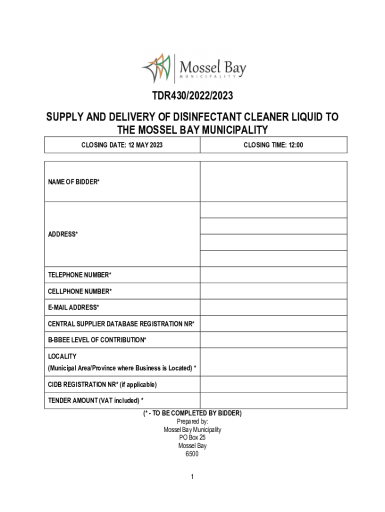 TDR430/2022/2023 SUPPLY AND DELIVERY OF DISINFECTANT CLEANER LIQUID TO THE MOSSES BAY MUNICIPALITY CLOSING DATE: 12 MAY 2023CLOSING TIME: 12:00NAME OF BIDDER×ADDRESS×TELEPHONE NUMBER* CELLPHONE