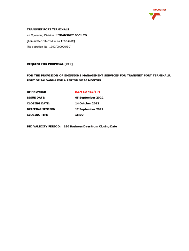 TRANSFER PORT TERMINALS an Operating Division of TRANSFER SOC LTD [hereinafter referred to as Transnet] [Registration No. 1990/000900/30]REQUEST FOR PROPOSAL [RFP]FOR THE PROVISION OF EMISSIONS MANAGEMENT