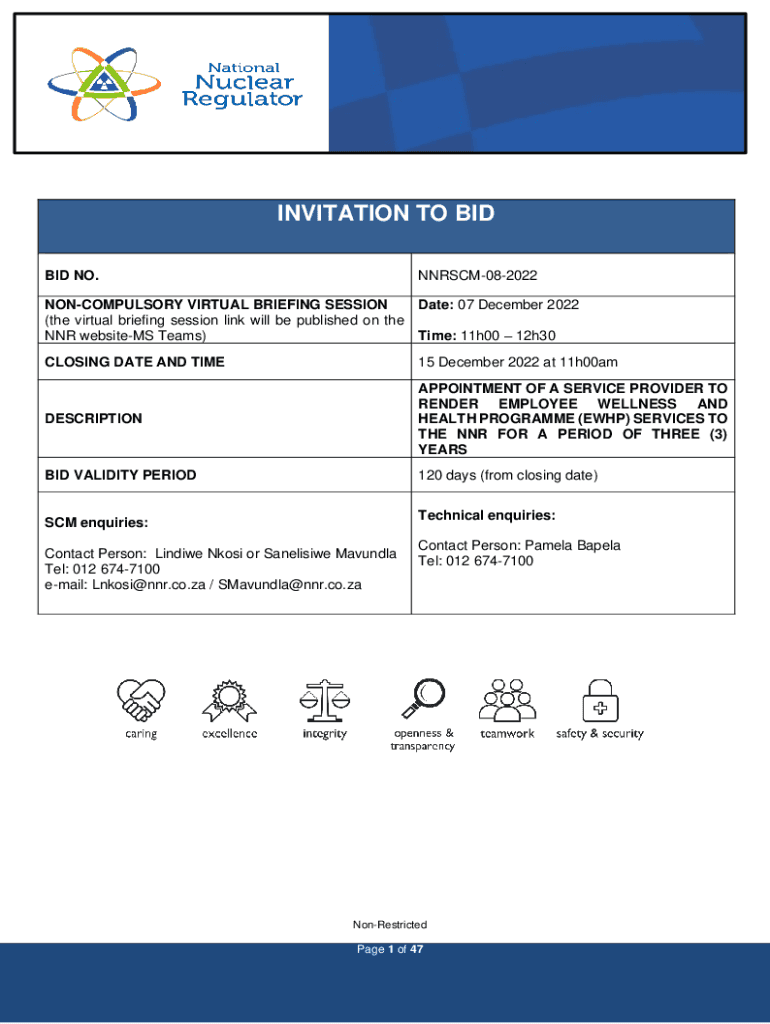 INVITATION TO BID NO.NNRSCM082022NONCOMPULSORY VIRTUAL BRIEFING SESSION Date: 07 December 2022 (the virtual briefing session link will be published on the NOR websites Teams) Time: 11h00 12h30 CLOSING