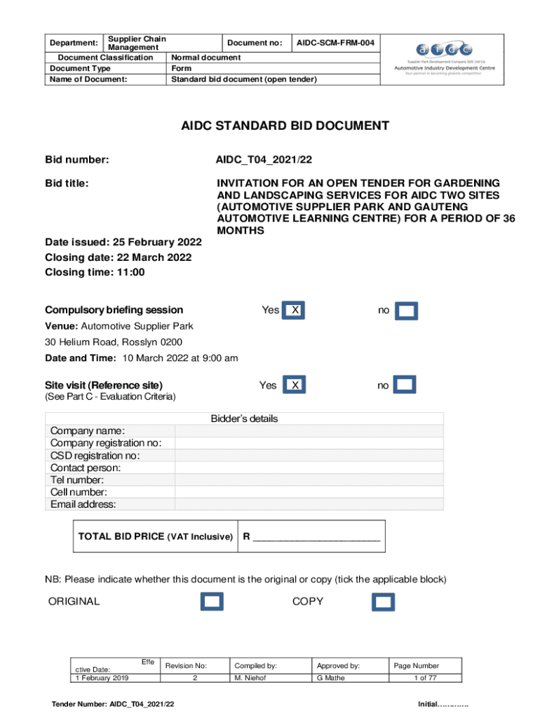 Supplier Chain Document no: AIDCSCMFRM004 Management Document Classification Normal document Type Form Name of Document: Standard bid document (open tender) Department:AID STANDARD BID DOCUMENT Bid
