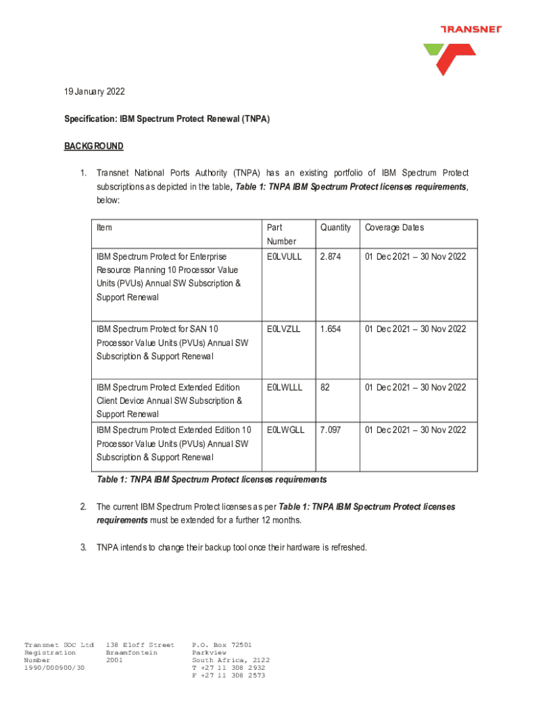 19 January 2022 Specification: IBM Spectrum Protect Renewal (TNA) BACKGROUND 1. Transnet National Ports Authority (TNA) has an existing portfolio of IBM Spectrum Protect subscriptions as depicted