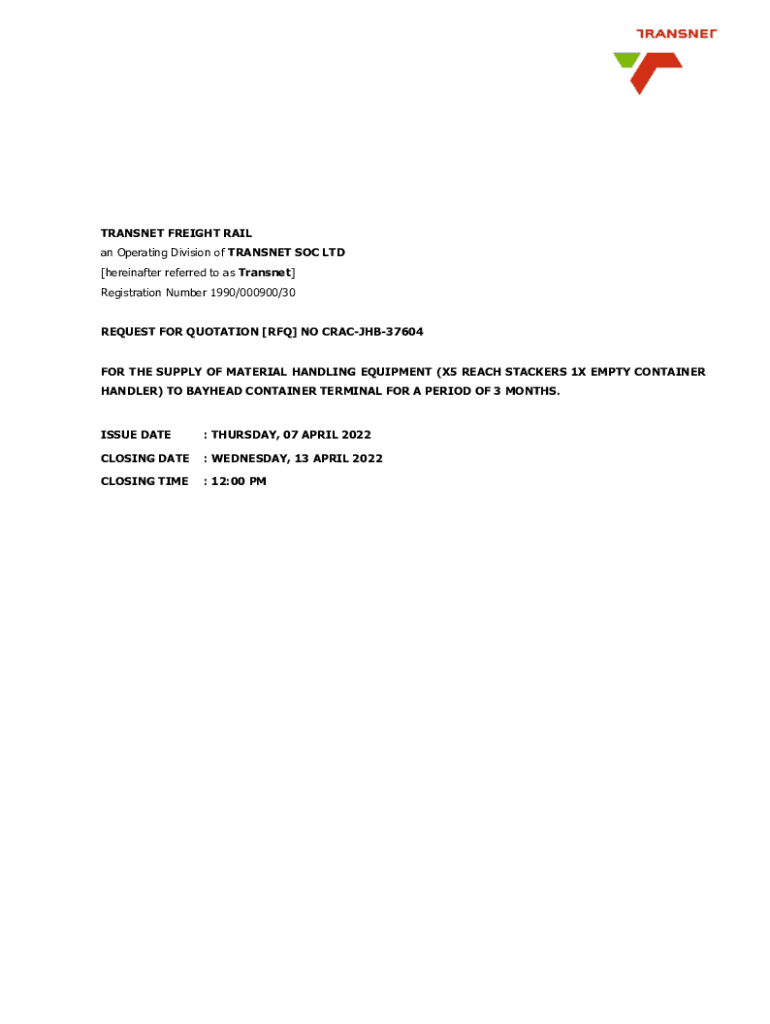 TRANSFER FREIGHT RAIL an Operating Division of TRANSFER SOC LTD [hereinafter referred to as Transnet] Registration Number 1990/000900/30 REQUEST FOR QUOTATION [RFQ] NO CRACJHB37604 FOR THE SUPPLY