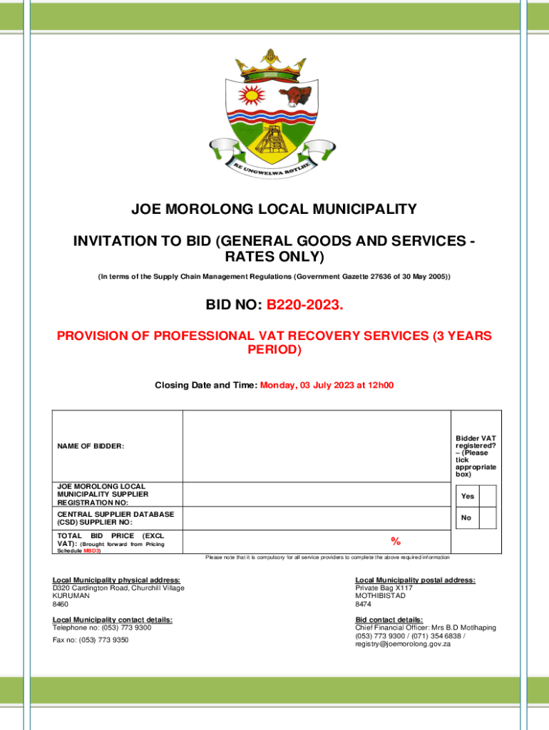 JOE PROLONG LOCAL MUNICIPALITY INVITATION TO BID (GENERAL GOODS AND SERVICES RATES ONLY) (In terms of the Supply Chain Management Regulations (Government Gazette 27636 of 30 May 2005))BID NO: B2202023.