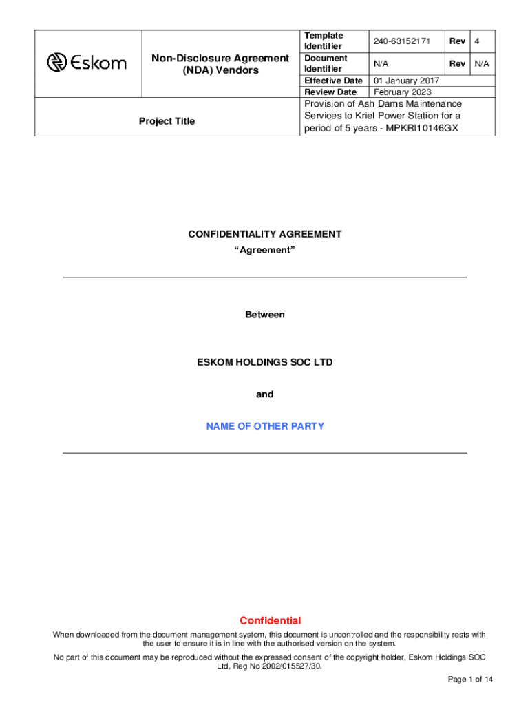 Nondisclosure Agreement (NDA) VendorsTemplate Identifier Document Identifier Effective Date Review Date24063152171Rev4N/Aren/A01 January 2017 February 2023Provision of Ash Dams Maintenance Services