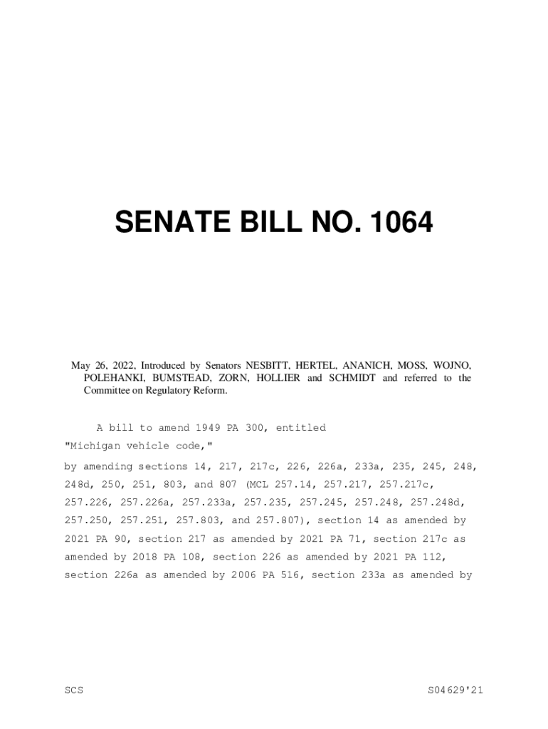 SENATE BILL NO. 1064May 26, 2022, Introduced by Senators DESPITE, HERE, ANANIAS, MOSS, WON,