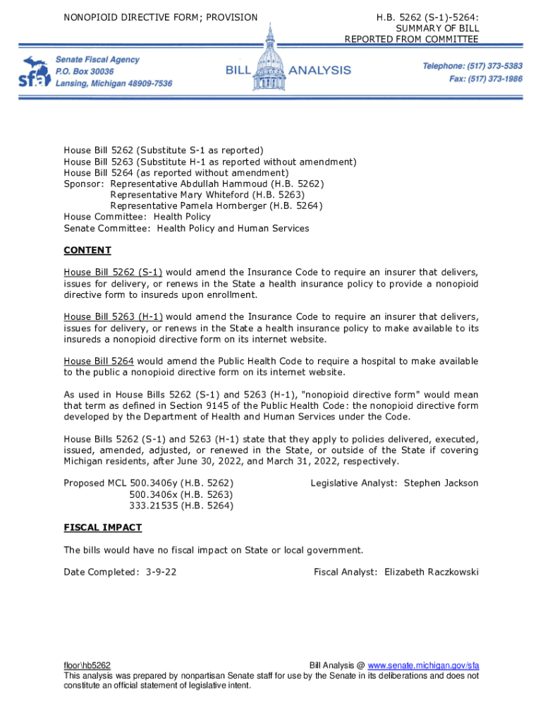OPIOID DIRECTIVE FORM; PROVISION. B. 5262 (S1)5264: SUMMARY OF BILL REPORTED FROM COMMITTEE House Bill 5262 (Substitute S1 as reported) House Bill 5263 (Substitute H1 as reported without amendment)