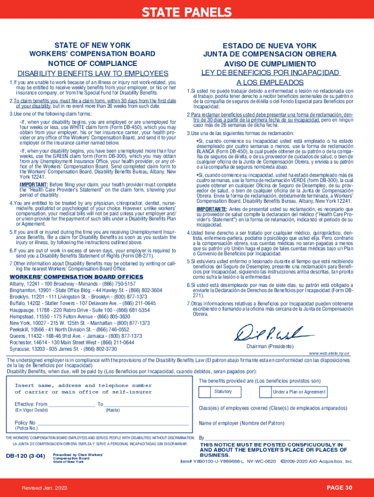 STATE PANELSNotice of Compliance (Blue) for Disability Benefits supplied by your insurance carrier. STATE OF NEW YORK WORKERS COMPENSATION BOARD NOTICE OF COMPLIANCE DISABILITY BENEFITS LAW TO EMPLOYEES1.