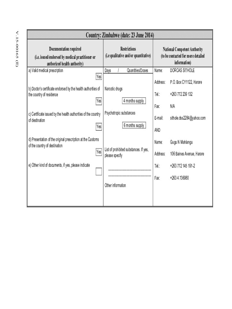 V.1500165 (E)Country: Zimbabwe (date: 23 June 2014) Documentation required (i.e. issued/endorsed by medical practitioner or authorized health authority)Restrictions (i.e. qualitative and/or quantitative)a)