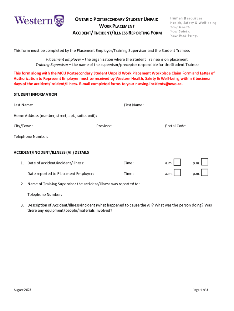ONTARIO POSTSECONDARY STUDENT UNPAID WORK PLACEMENT ACCIDENT/ INCIDENT/ILLNESS REPORTING Formula ResourcesHealth, Safety & Wellbeing Your Health. Your Safety. Your Wellbeing. This form must be completed