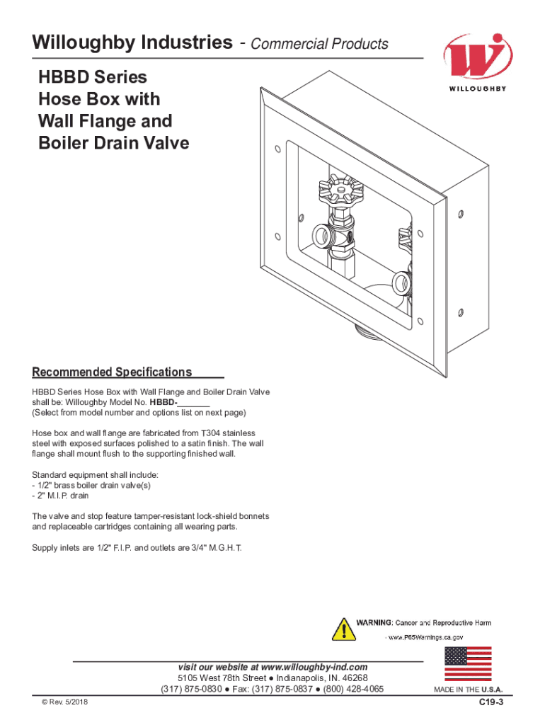 Willougbhy Industries Commercial Products BBD Series Hose Box with Wall Flange and Boiler Drain Valve5HFRPPHQGHG6SHFLFDWLRQV BBD Series Hose Box with Wall Flange and Boiler Drain Valve shall be: Willougbhy