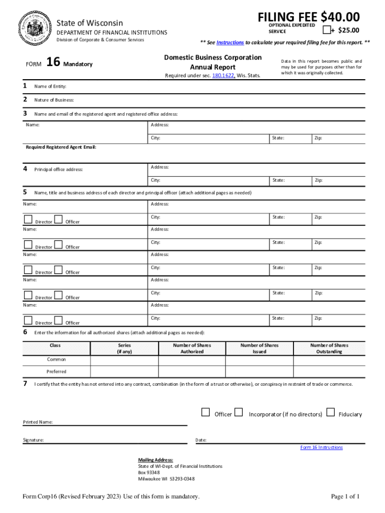 FILING FEE $40.00State of WisconsinOPTIONAL EXPEDITED SERVICEDEPARTMENT OF FINANCIAL INSTITUTIONS Division of Corporate & Consumer ServicesFORM** See Instructions to calculate your required filing