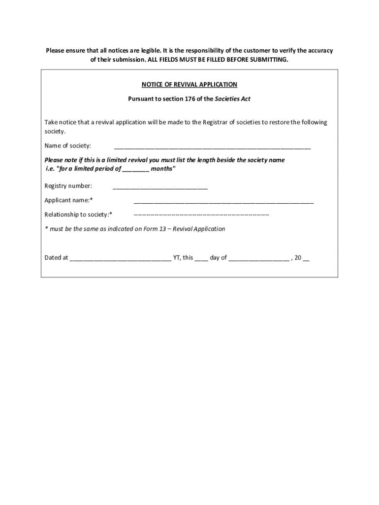 Get the free Notice of revival application for Yukon Gazette