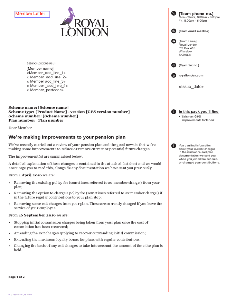 Member Letter[Team phone no.] Mon Thurs, 8.00am 6.00pm Fri, 8.00am 5.00pm [Team email mailbox] [Team name] Royal London PO Box 413 Willow SK9 0EN9999/XX1/XXX/001/01/1[Member name] Member_add_line_1