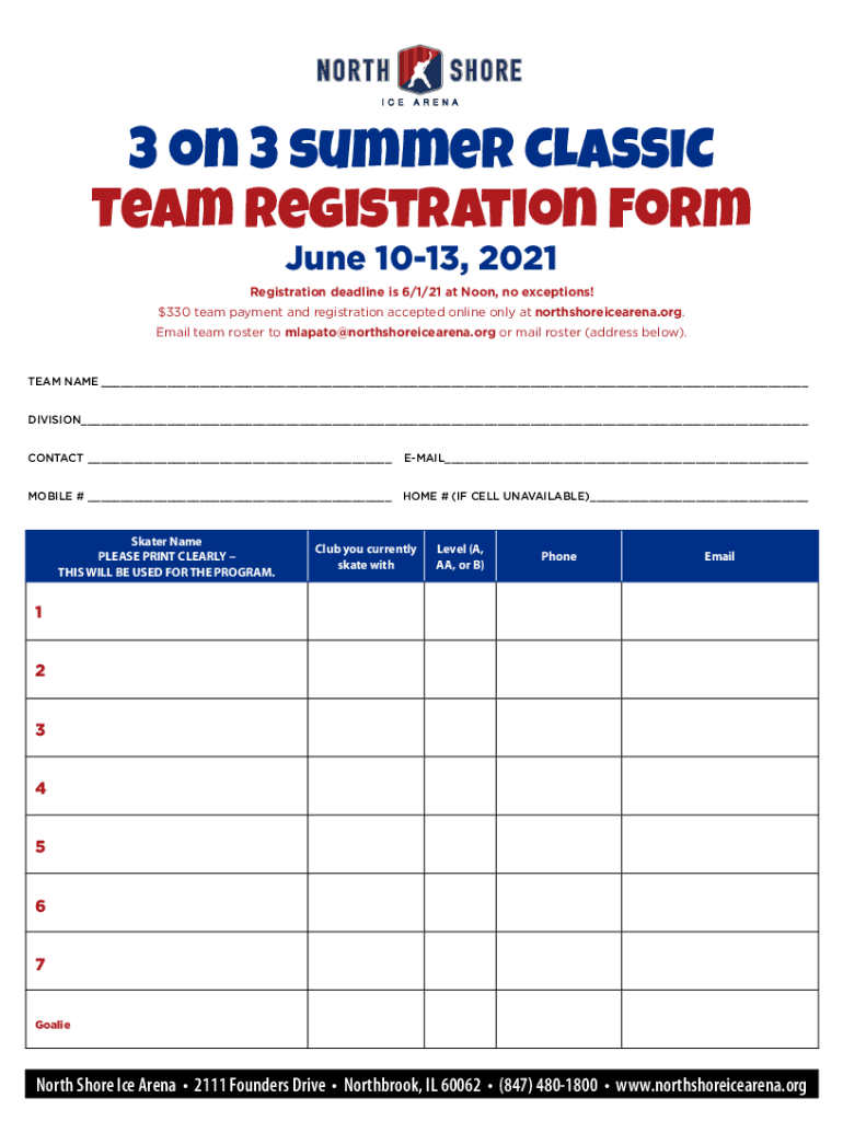 3 on 3 summer CLASSIC Team Registration Form June 1013, 2021Registration deadline is 6/1/21 at Noon, no exceptions! $330 team payment and registration accepted online only at northshoreicearena.org.