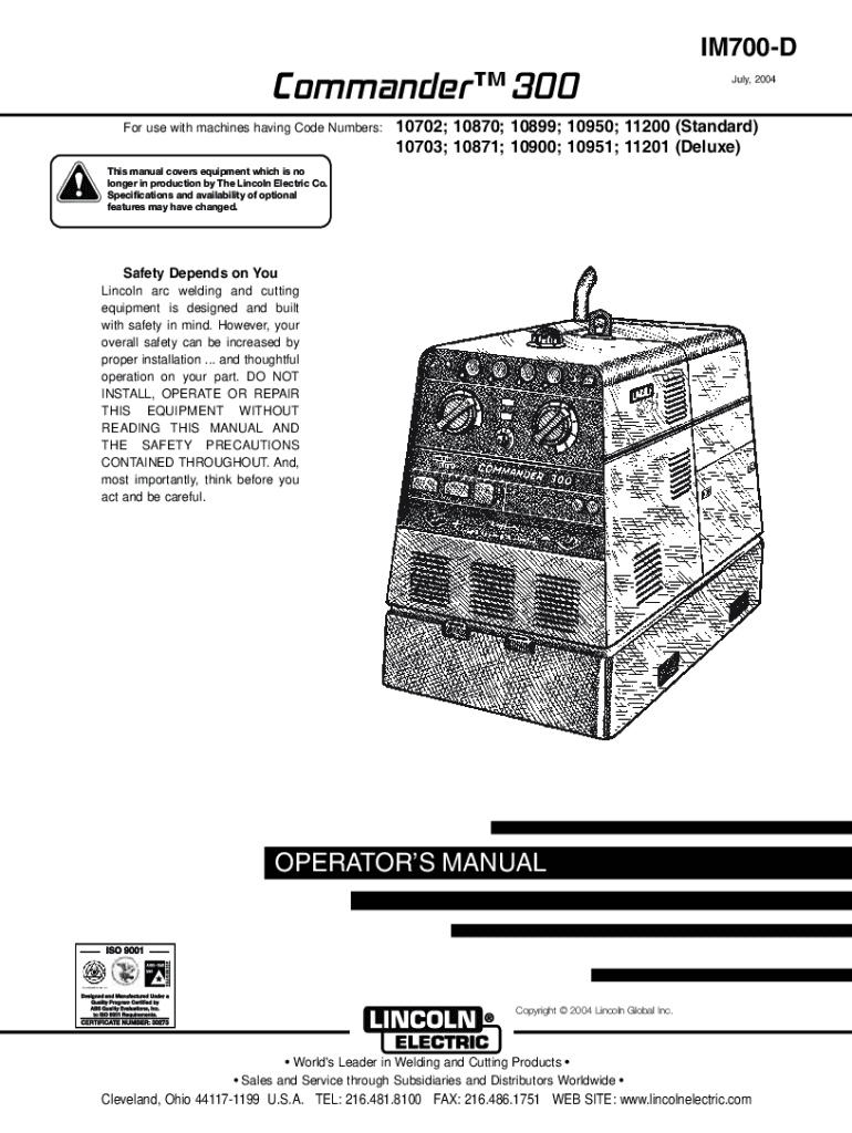 IM700DCommander 300 For use with machines having Code Numbers:July 200410702; 10870; 10899; 10950; 11200 (Standard) 10703; 10871; 10900; 10951; 11201 (Deluxe)This manual covers equipment which is