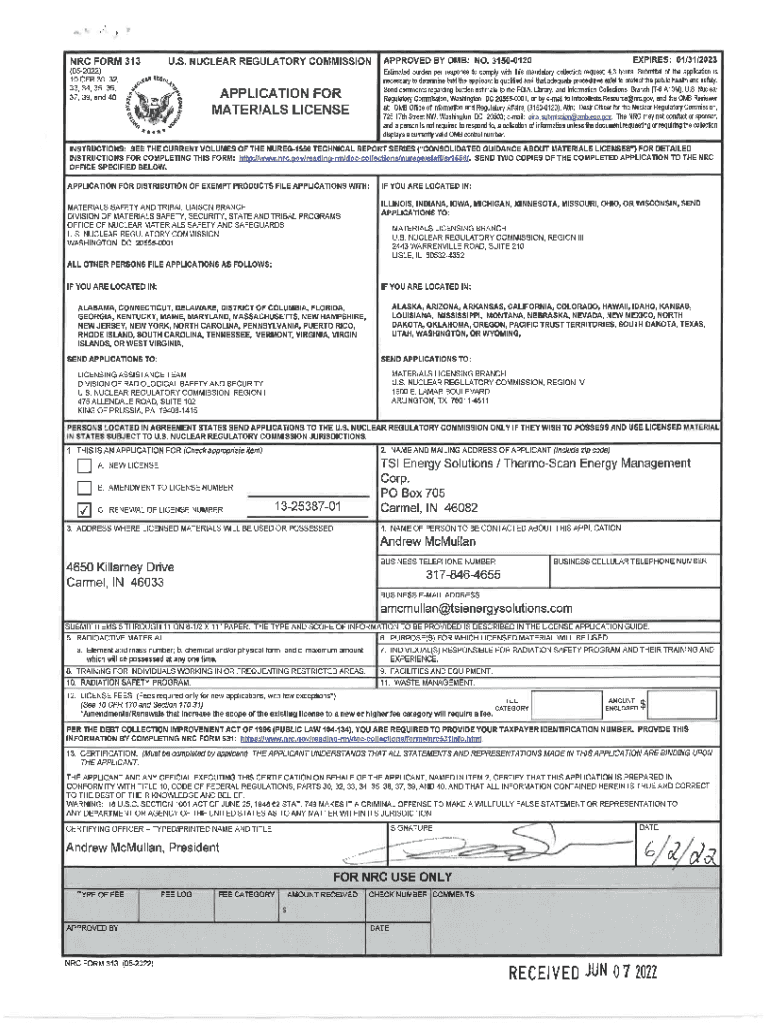 , .\'NRC FORM 313U. S. NUCLEAR REGULATORY COMMISSION(052022) 10 CFR 30, 32, 33, 34, 35, 36, 37, 39, and 40EXPIRES: 01/31/2023APPROVED BY 0 MB: NO. 31500120Estimated burden per response !c comply