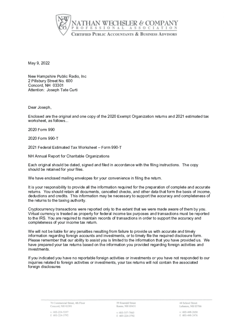 May 9, 2022, New Hampshire Public Radio, Inc 2 Pillsbury Street No. 600 Concord, NH 03301 Attention: Joseph Tate Untidier Joseph, Enclosed are the original and one copy of the 2020 Exempt Organization