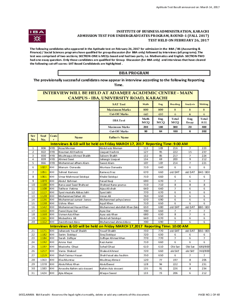 Aptitude Test Result announced on: March 14, 2017INSTITUTE OF BUSINESS ADMINISTRATION, KARACHI ADMISSION TEST FOR UNDERGRADUATES PROGRAM, ROUND1 (FALL 2017) TEST HELD ON FEBRUARY 26, 2017, The following