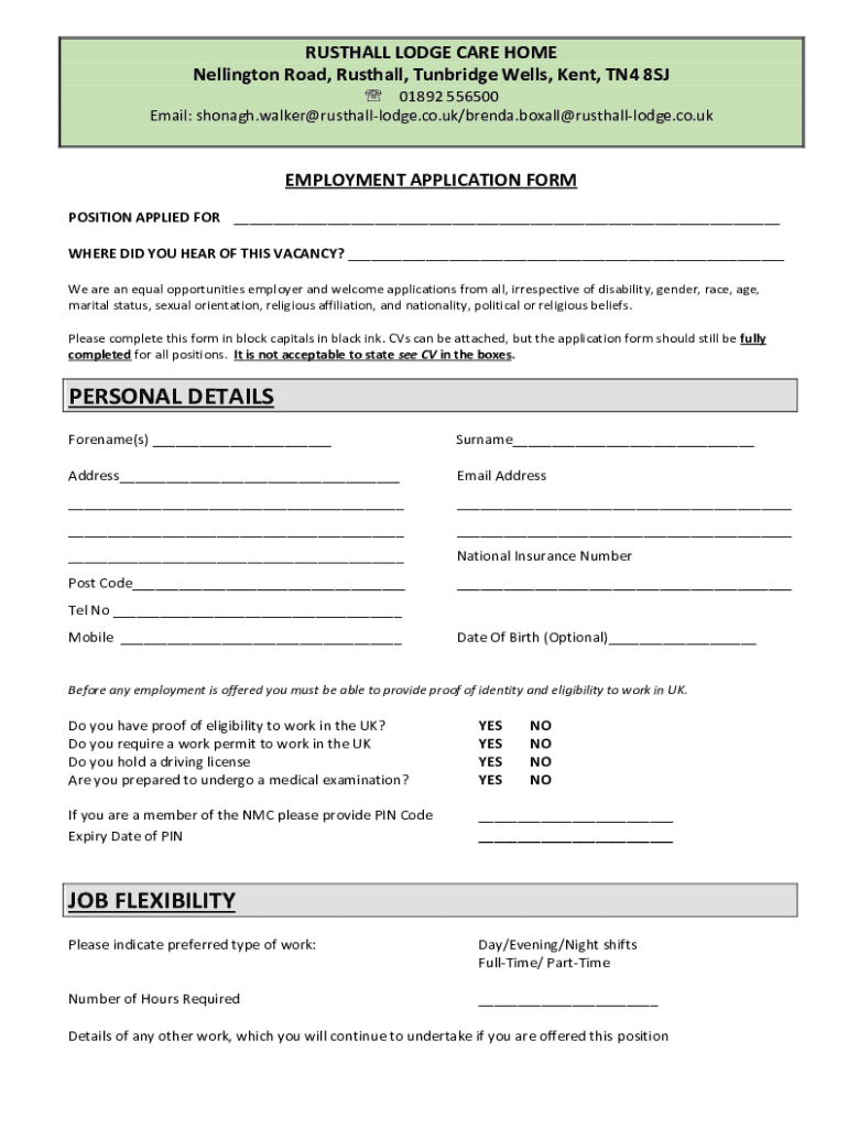 SHALL LODGE CARE HOME Wellington Road, Rust hall, Tun bridge Wells, Kent, TN4 8SJ 01892 556500 Email: shonagh.walker@rusthalllodge.co.uk/brenda.boxall@rusthalllodge.co.ukEMPLOYMENT APPLICATION FORM