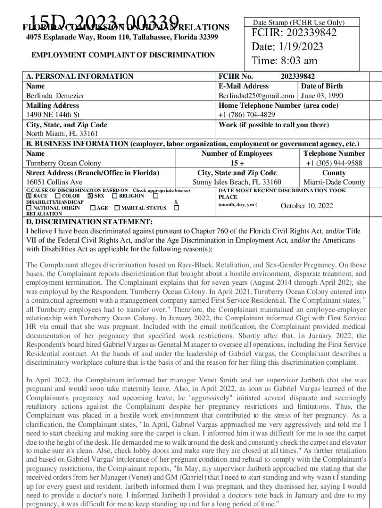 15D202300339FLORIDA COMMISSION ON HUMAN RELATIONS 4075 Esplanade Way, Room 110, Tallahassee, Florida 32399 EMPLOYMENT COMPLAINT OF DISCRIMINATIONDate Stamp (CHR Use Only)CHR: 202339842 Date: 1/19/2023