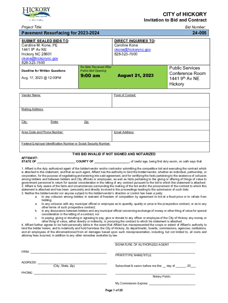 CITY of HICKORYInvitation to Bid and Contract Project Title:Bid Number:Pavement Resurfacing for 20232024 SUBMIT SEALED BIDS TO: Caroline M. One, PE 1441 9th Av NE Hickory NC 28601 ckone@hickorync.gov