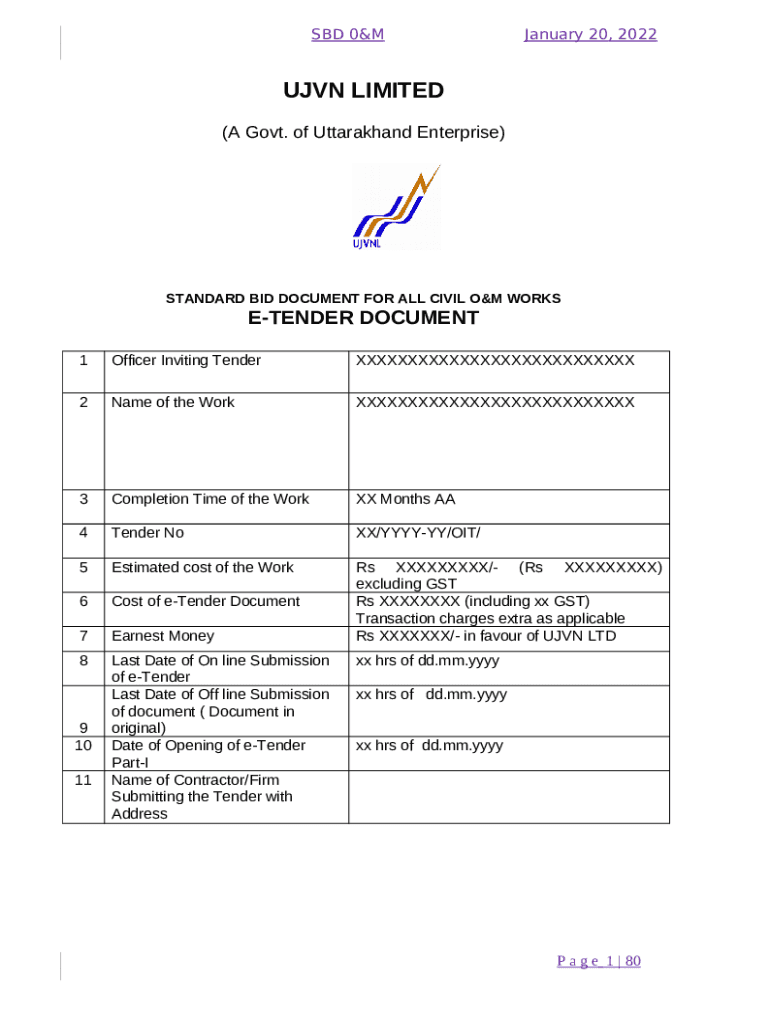 The UJVN LTD. (A Govt. of Uttarakhand Enterprise ) E-TENDER ... is a Word document which can be completed and signed for certain needs. Next, it is furnished to the actual addressee in order to provide some details of any kinds. The completion and signing is available in hard copy by hand or via a trusted service e. g. PDFfiller. These tools help to submit any PDF or Word file online. It also lets you customize its appearance depending on your requirements and put legit electronic signature. Once done, you send the UJVN LTD. (A Govt. of Uttarakhand Enterprise ) E-TENDER ... to the respective recipient or several ones by mail or fax. PDFfiller offers a feature and options that make your template printable. It has a variety of settings for printing out. No matter, how you deliver a document - in hard copy or electronically - it will always look well-designed and clear. To not to create a new document from the beginning again and again, turn the original Word file into a template. After that, you will have an editable sample.