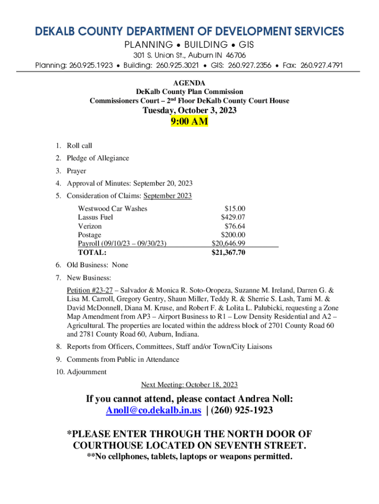 DEKALB COUNTY DEPARTMENT OF DEVELOPMENT SERVICES PLANNING BUILDING GIS301 S. Union St., Auburn IN 46706 Planning: 260.925.1923 Building: 260.925.3021 GIS: 260.927.2356 Fax: 260.927.4791AGENDA DeKalb
