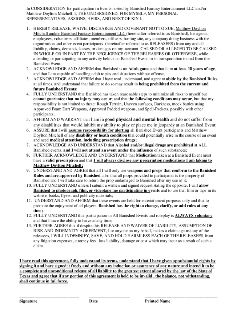 In CONSIDERATION for participation in Events hosted by Banished Fantasy Entertainment LLC and/or Matthew Bolton Mitchell, I, THE UNDERSIGNED, FOR MYSELF, MY PERSONAL REPRESENTATIVES, ASSIGNS, HEIRS,