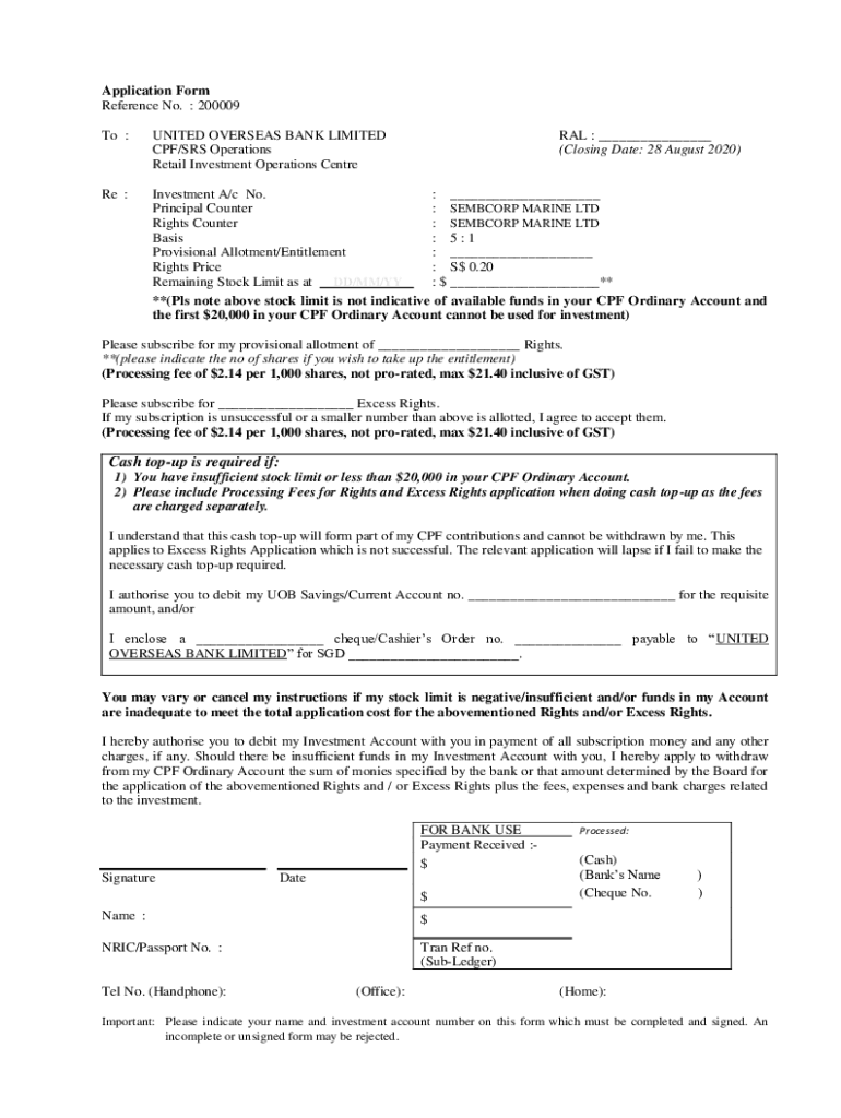 Application Form Reference No. 200009 To :UNITED OVERSEAS BANK LIMITED CPF/SRS Operations Retail Investment Operations Central : ___ (Closing Date: 28 August 2020’Re :Investment A/c No. ___ Principal