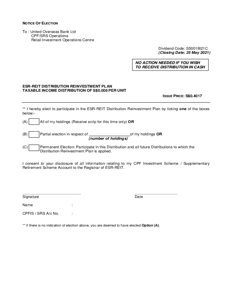 NOTICE OF ELECTION To : United Overseas Bank Ltd CPF/SRS Operations Retail Investment Operations Center Dividend Code: S50018I21C (Closing Date: 25 May 2021) NO ACTION NEEDED IF YOU WISH TO RECEIVE