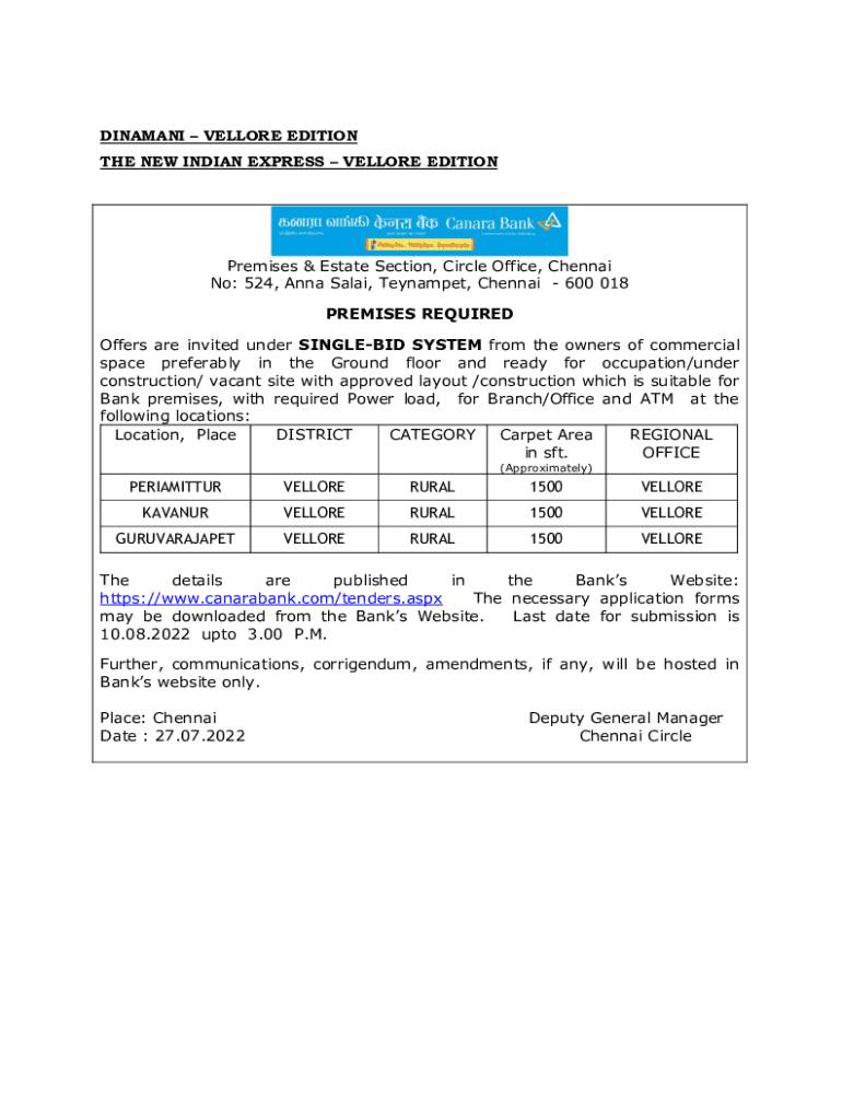 DIAMOND NELLORE EDITION THE NEW INDIAN EXPRESS NELLORE EDITIONPremises & Estate Section, Circle Office, Chennai No: 524, Anna Salad, Parapet, Chennai 600 018 PREMISES REQUIRED Offers are invited under