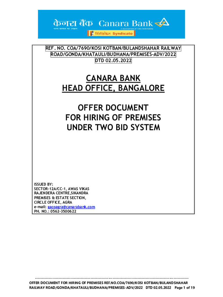 REF. NO. COA/7690/OSI KOREAN/BULANDSHAHAR RAILWAY ROAD/HONDA/KATSUKI/BUCHANAN/PREMISES ADV/2022 DID 02.05.2022CANARA BANK HEAD OFFICE, BANGALORE OFFER DOCUMENT FOR HIRING OF PREMISES UNDER TWO BID