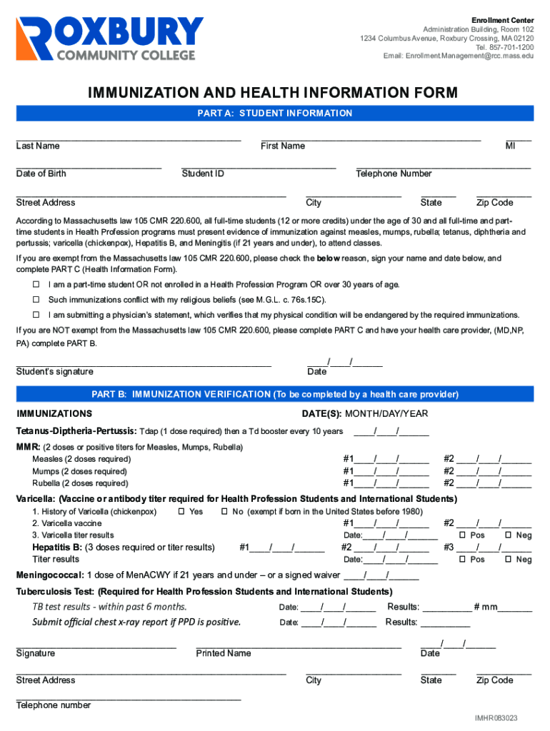 Enrollment Center Administration Building, Room 102 1234 Columbus Avenue, Roxbury Crossing, MA 02120 Tel. 8577011200 Email: Enrollment.Management@rcc.mass.eduIMMUNIZATION AND HEALTH INFORMATION FORM