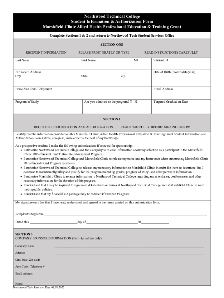 North wood Technical College Student Information & Authorization Form Marsh field Clinic Allied Health Professional Education & Training Grant Complete Sections 1 & 2 and return to North wood Tech