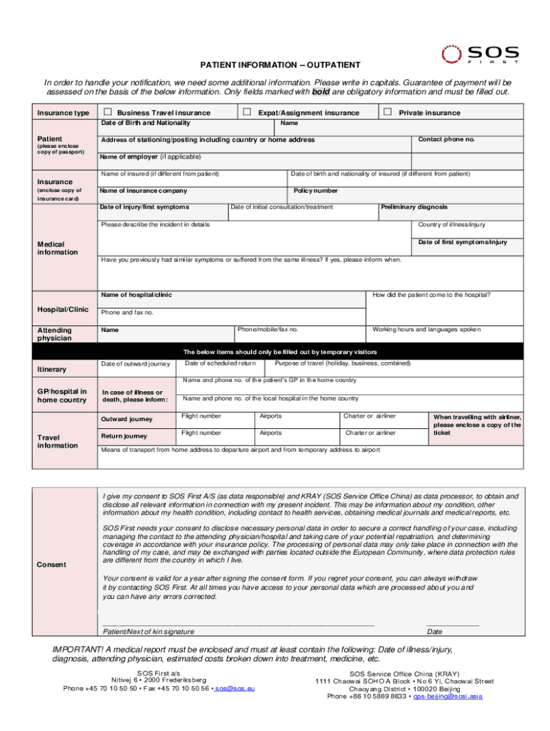 PATIENT INFORMATION OUTPATIENT In order to handle your notification, we need some additional information. Please write in capitals. Guarantee of payment will be assessed on the basis of the below