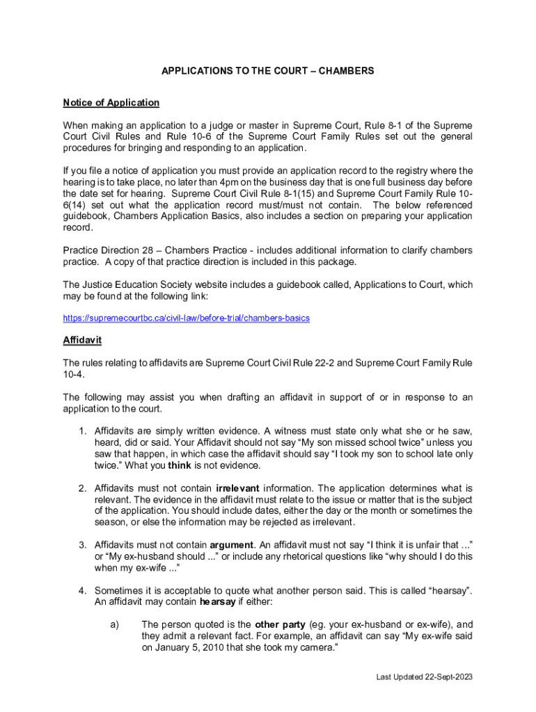 APPLICATIONS TO THE COURT CHAMBERS Notice of Application When making an application to a judge or master in Supreme Court, Rule 81 of the Supreme Court Civil Rules and Rule 106 of the Supreme Court