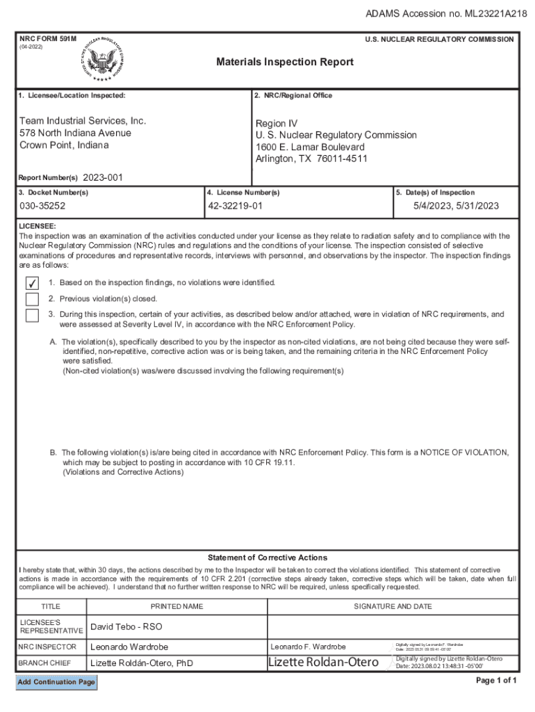 Get the free NRC Form 591M, Inspection Report 03038376/2023001