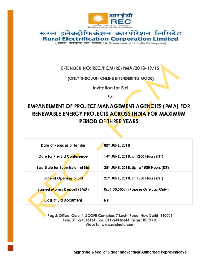 TENDER NO: REC/PCM/RE/PMA/201819/15 (ONLY THROUGH ONLINE TENDERING MODE)Invitation for Bid ForEMPANELMENT OF PROJECT MANAGEMENT AGENCIES (PMA) FOR RENEWABLE ENERGY PROJECTS ACROSS INDIA FOR MAXIMUM