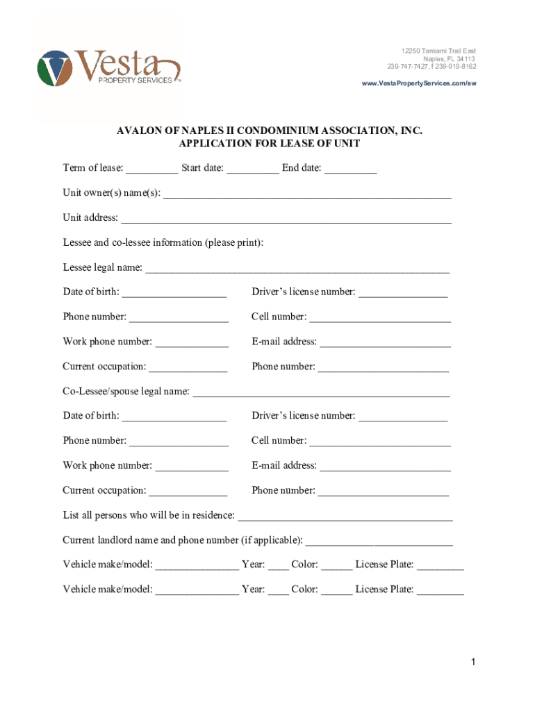 12250 Tamiami Trail East Naples, FL 34113 2397477427, f 2399198162 www.VestaPropertyServices.com/swAVALON OF NAPLES II CONDOMINIUM ASSOCIATION, INC. APPLICATION FOR LEASE OF UNIT Term of lease: ___