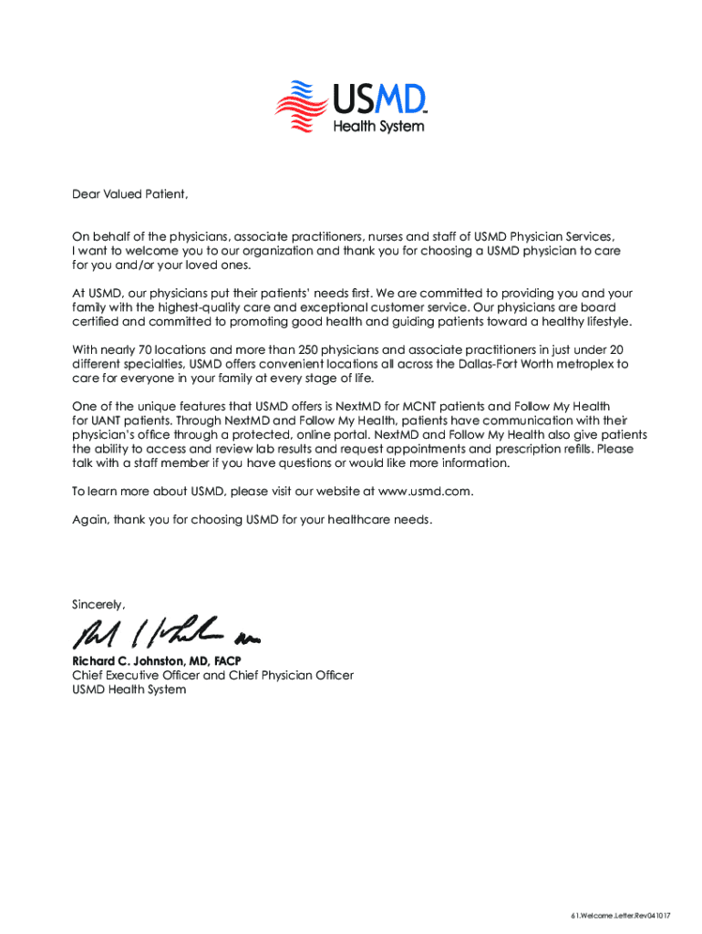 Dear Valued Patient, On behalf of the physicians, associate practitioners, nurses and staff of USED Physician Services, I want to welcome you to our organization, and thank you for choosing a USED