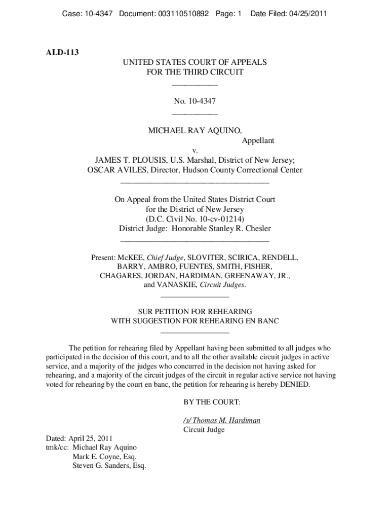 Case: 104347 Document: 003110510892 Page: 1Date Filed: 04/25/2011ALD113 UNITED STATES COURT OF APPEALS FOR THE THIRD CIRCUIT ___ No. 104347 ___ MICHAEL RAY AQUINO, Appellant v. JAMES T. LOUIS, U.S.