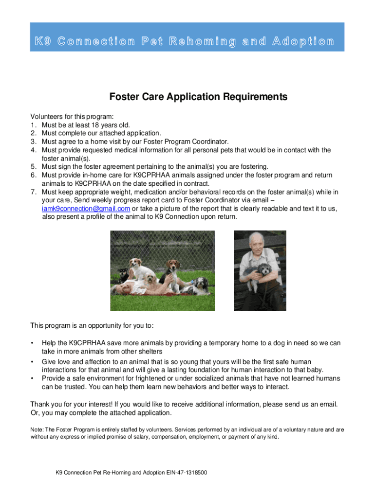 Foster Care Application Requirements Volunteers for this program: 1. Must be at least 18 years old. 2. Must complete our attached application. 3. Must agree to a home visit by our Foster Program Coordinator.