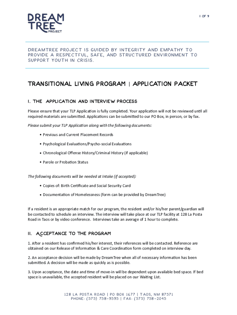 1! Of 9 ! Dreamtime Project is guided by integrity and empathy to provide a respectful, safe, and structured environment to support youth in crisis. Transitional Living Program | application Packet